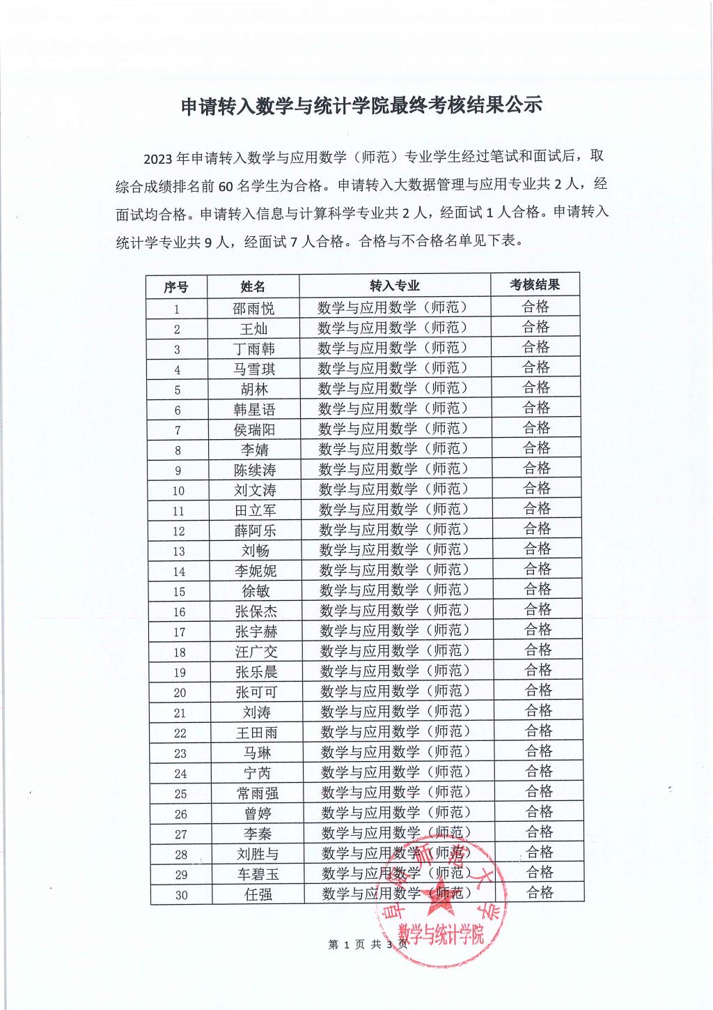 2023年第一志愿申请转入数学与统计学院最终考核结果公示