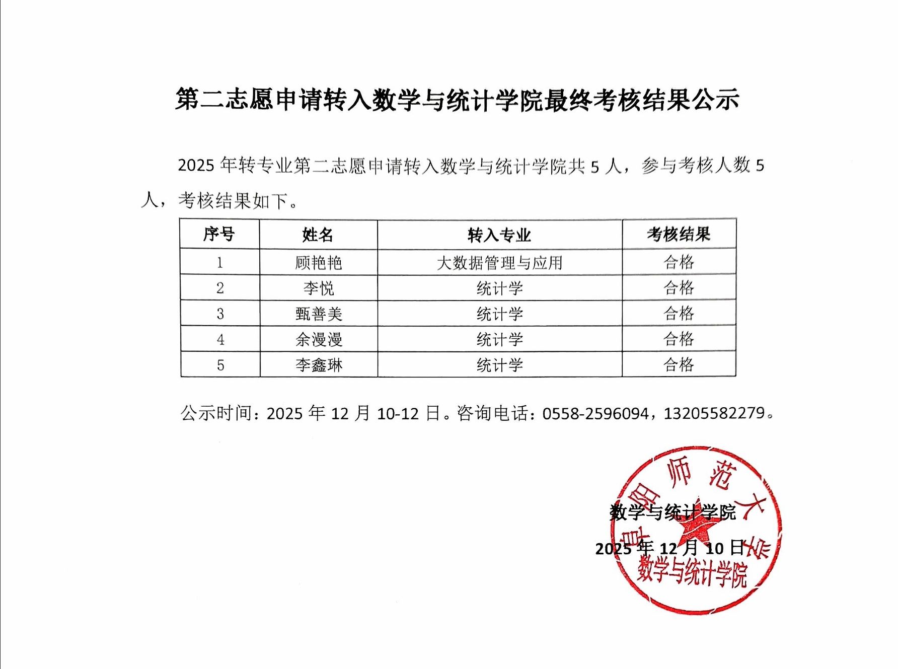 第二志愿申请转入数学与统计学院最终考核结果公示