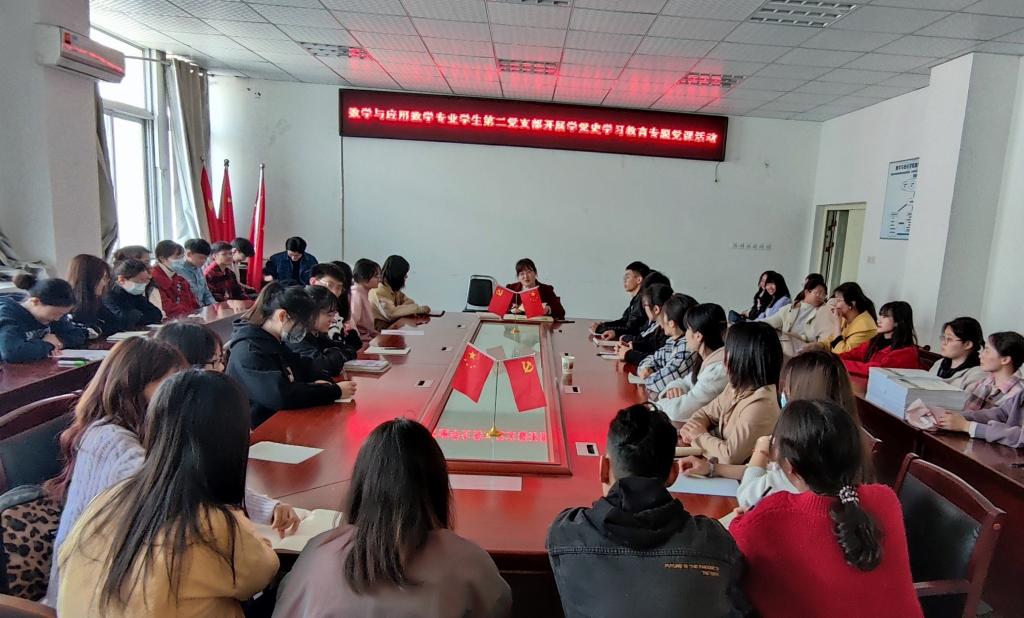 数学与应用数学专业学生第二党支部书记李艳讲授《中国共产党的创建和投身大革命的洪流》专题党课。从近代中华民族伟大复兴的历史任务和各种力量的艰难探索,五四运动和马克思主义在中国的传播,中国共产党的成立和民主革命纲领的制定,第一次国共合作和大革命高潮的兴起,北伐战争和工农运动,到国共合作的破裂和大革命的失败……生动鲜活地讲述了中国共产党诞生的艰辛历程。