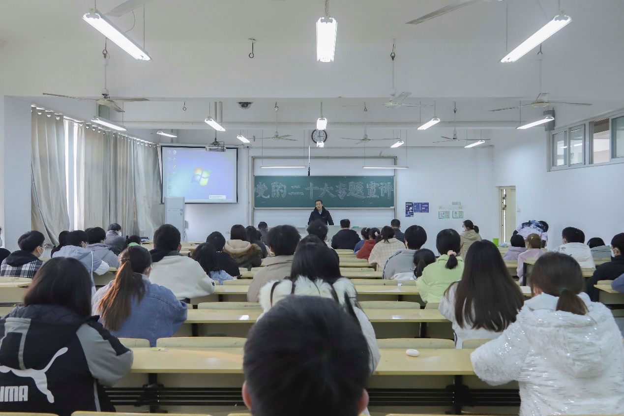 12月8日下午,校党委常委、纪委书记、监察专员季爱新,深入我院联系班级宣讲党的二十大精神。宣讲报告由该院党委书记吴尝主持,在躬行D楼413举行。