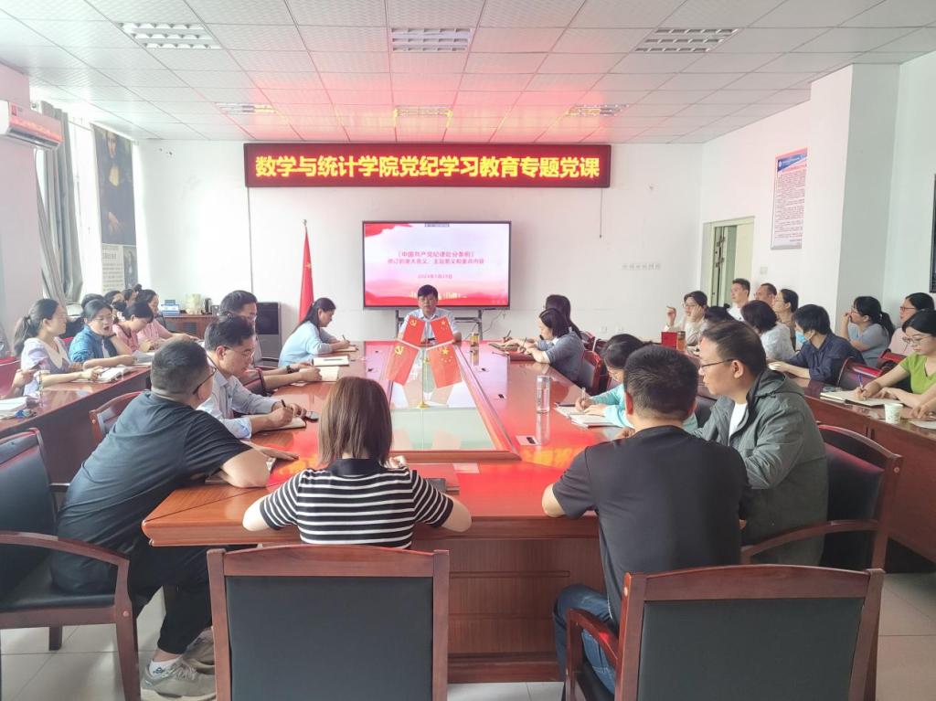 为推动党纪学习教育走深走实,进一步强化党的纪律建设,5月29日下午,数学与统计学院党委书记、院长盛兴平在躬行D楼512会议室讲授党纪学习教育专题党课,学院全体教工党员参会。