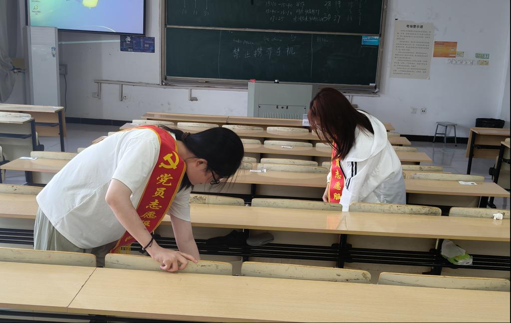 组织志愿活动,树立先锋模范。为保证学生的上课质量,维护学习环境并提高教师的授课体验感,6.18日-6.20日学院组织学生社区党支部党员冲在教育一线,深入教室进行桌椅损坏检查和设备安全排查,从桌椅的倾斜、摇晃程度到黑板的推拉难易再到插排与电脑接线的安全检查,用严谨的态度、细心的程度为学生营造一个舒适的学习环境,用实际行动积极响应“我为师生办实事”的号召。