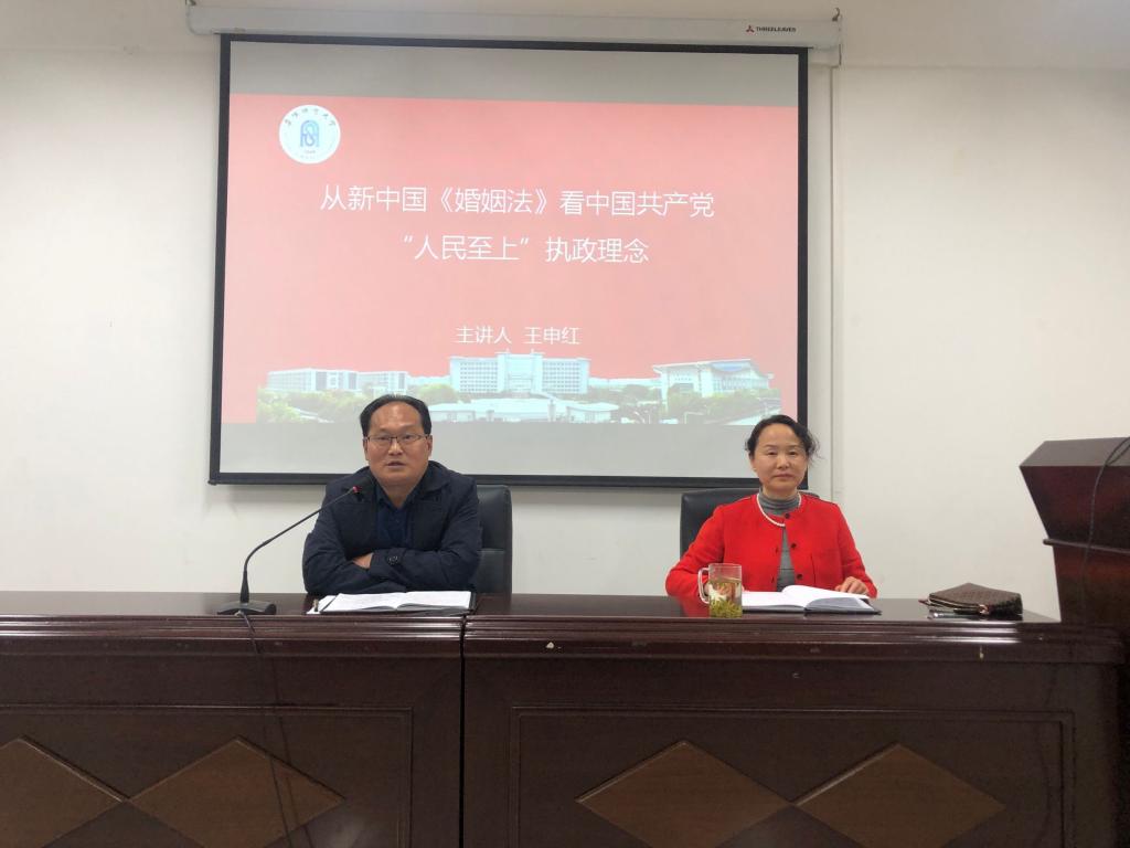 2021年4月21日下午,图书馆在正行楼315室举办了面向全馆党员和群众的由馆长王申红主讲的题为《从新中国婚姻法感悟中国共产党“人民至上”执政理念》的党史讲座。讲座由图书馆党总支书记梁长武主持。