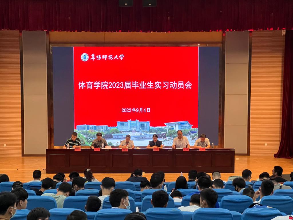 2022年9月4日下午,阜阳师范大学体育学院2023届毕业生实习动员会在西湖校区正行楼多功能报告厅如期召开。参会人员有体育学院党委书记于少华、院长刘玉、党委副书记石有武、副院长杨中皖、实习负责人余卫东、全体实习指导老师以及2023届全体毕业生,会议由杨中皖主持。