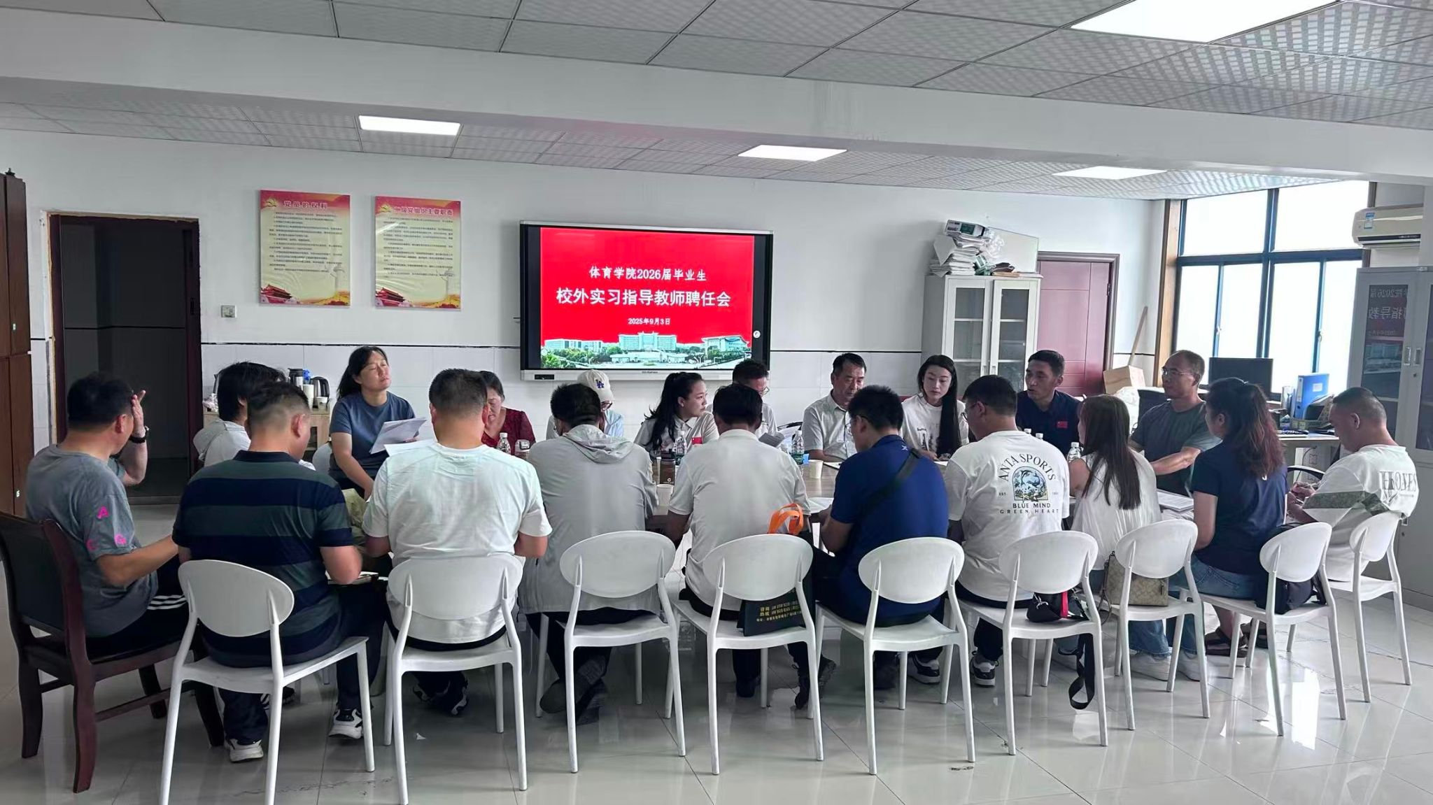 9月3日下午,体育学院2026届毕业生委托实习指导教师聘任会于体育馆三楼会议室顺利召开。体育学院副院长杨中皖、各实习基地受聘教师以及实习负责人余卫东共同出席仪式,会议由余卫东主持。
