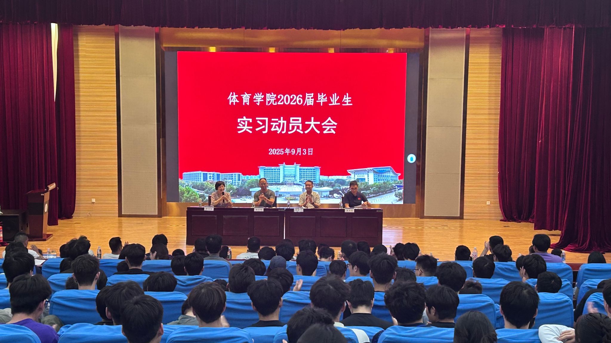同日,2026届毕业生实习动员大会于西湖校区正行楼多功能报告厅举行。体育学院党委副书记徐春婷、副院长杨中皖、实习负责人余卫东、全体实习指导教师及2026届毕业生参会,徐春婷主持会议。