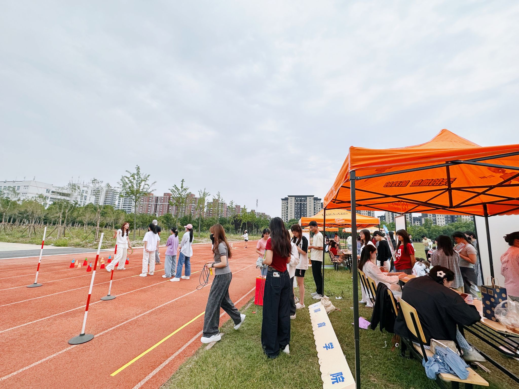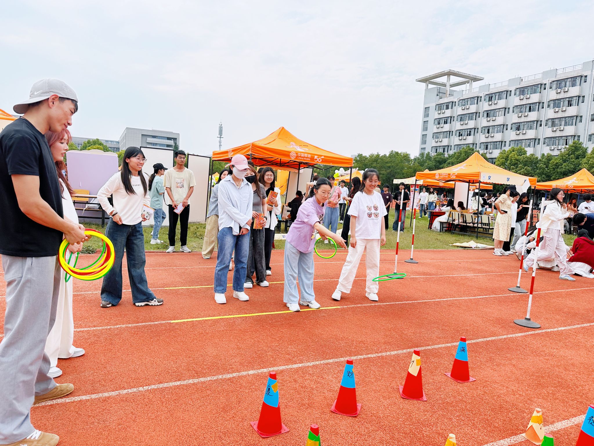 作为本届心理嘉年华的重要组成部分,体育学院承办的“心跃向阳跑”活动充分发挥专业优势,巧妙融合运动与心理调适,设计了两个富有特色的互动环节,分别为“心情障碍田径赛”和“套圈心理大挑战”。在“心情障碍田径赛”中,参与者首先在便签上书写近期烦恼或心愿,随后踏上赛道:敏捷绕过“之”字形排列的10个锥桶,象征跨越生活阻碍;紧接着完成20米跳绳冲刺,在运动中释放压力。最后,将承载心事的便签投入“解忧箱”,寓意卸下负担,轻装前行。在“套圈心理大挑战”中,参与者手持三个套圈,瞄准标注着“快乐”、“放松”、“勇气”等积极心理品质的立牌进行投掷。挑战过程既充满趣味,也引导参与者关注和追求积极心态。成功者获得专属纪念贴纸,现场气氛活跃。