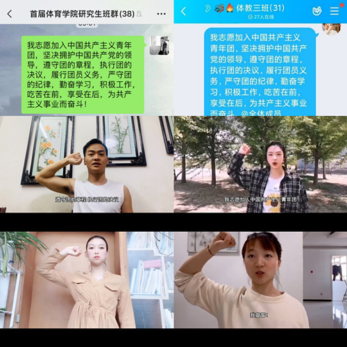 在2020年这个特殊的“五四”青年节来临之际,体育学院团委积极号召同学们努力学习五四精神,不断进取,真正从思想上加入到团的组织中去,以实现自己的入团誓词。体育学院各班级团支部宣传动员班级学生参与主题团日活动,广大团员积极响应,开展“重温入团宣誓词”线上视频录制。在视频中,广大团员们高举右手,紧握右拳,再次郑重地宣誓,宣誓铿锵有力,慷慨激昂。团员们举起的右手紧握的是共青团员的忠诚,专注的目光凝聚着共青团员的坚定。视频里回荡的神圣庄严的入团誓词,仿佛又让在场的全体共青团员回到了入团时那令人激动而又难忘的时刻,共青团员要勤奋学习,吃苦在前,享受在后,为共产主义事业而奋斗的信仰再一次得到了升华。