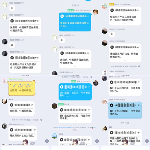 各团支书组织团员进行语音团歌的歌词接龙活动,团歌新唱展现异样青春风采。班级同学在自己班群里,你一句,我一句的接力团歌,唱出了青春的使命和担当。对大学生来说,这是一次大学生爱国爱团情感的升华和价值观体系的矫正,有利于高尚道德情操的培养,坚定信仰和决心,在现如今新时代显得尤为重要。