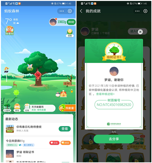 体育学院通过工作群转发的方式以图文并茂地介绍了几种“云”种树的流程和方式。领取小树苗、积累金币、收集能量、选择种树......大家通过倡议书的方法,选择自己喜欢的方式参与植树节活动。体院学子通过低碳行为积攒绿色能量,为各种虚拟树“浇水”,部分同学通过蚂蚁森林小程序人种了认种了2棵柠条、4棵梭梭树,并且为嘉塘保护地、老君山保护地和清水河保护地贡献了能量,获得2021春种林和2021植树节活动证书。2020级表演班周思颖同学说道:“‘饮水思泉,取之社会,用之社会’带着这份感恩与社会赋予我们的使命完成此次活动,让我们感受到一种成功的喜悦,绿树成荫,鸟语花香,是我们的期望。”