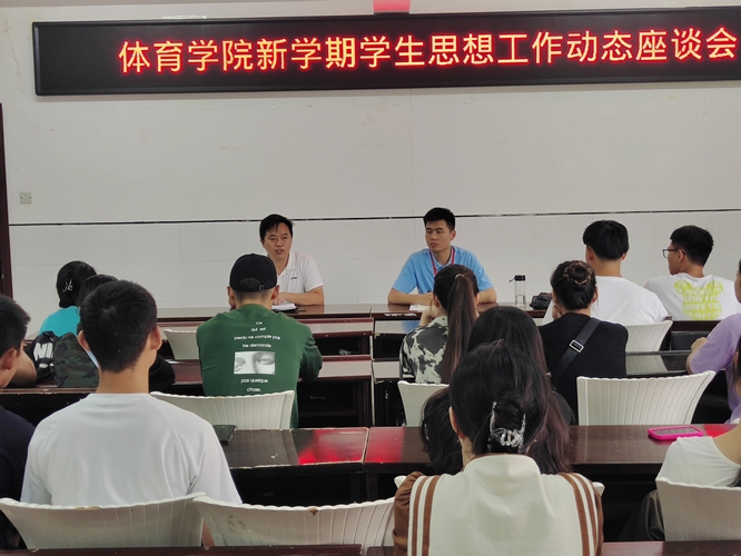 为了解新学期学生思想动态,针对性地做好学生工作,体育学院团委于9月15日下午在体育馆四楼召开了新学期学生思想工作座谈会。会议由体育学院党委副书记石有武主持,团委负责人刘安国及各班级学生代表共40人参会。