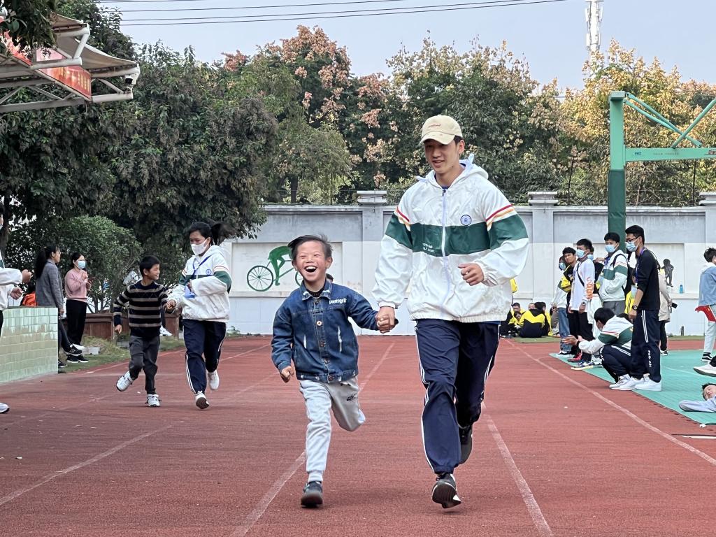 体育学院学生会成员以及志愿者们遵守防疫指南,全员佩戴好口罩、测量体温有序进入学校。体育学院学子为残障儿童表演舞蹈和武术,并与孩子们亲切互动。学生们脸上流露出阳光灿烂的笑容,他们的笑容也感染了我们志愿者。2021级体育教育四班汪峰同学现场同孩子们学习手语,通过两天的相处,能于孩子们进行简单的沟通,他表示:他们不能言语,但是他们的心扉却十分敞亮,他们那种乐观、坚强的品质深深的吸引我。孩子们在一系列比赛活动中凸显自己的能力与特长,而志愿者们也在其中锻炼自己的专业能力,培养自强不息的精神,大力弘扬人道主义思想和中华民族扶贫济困传统美德。