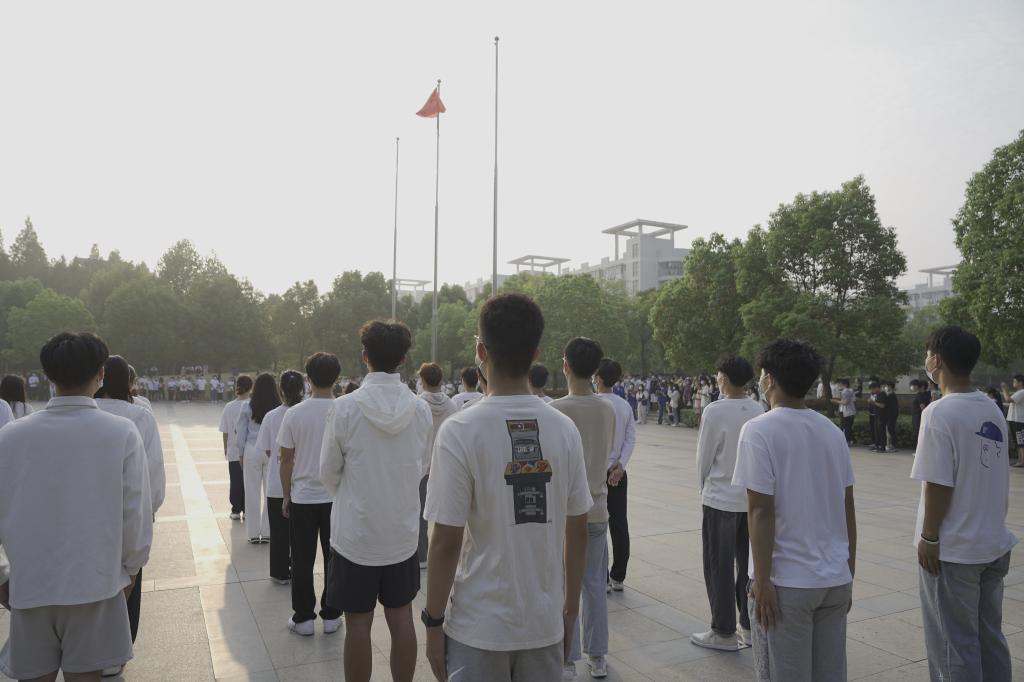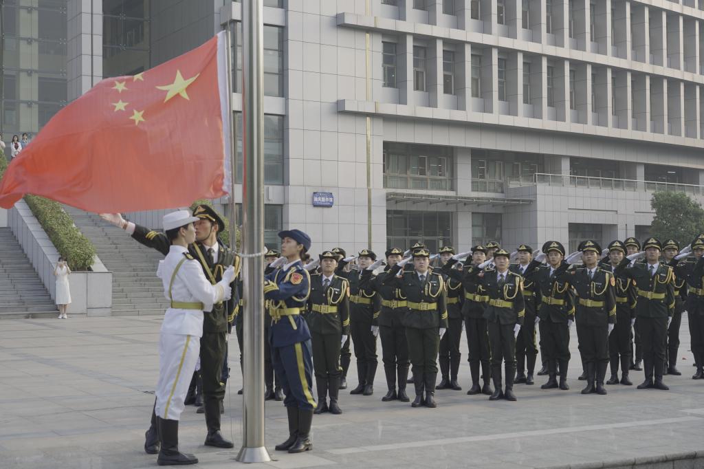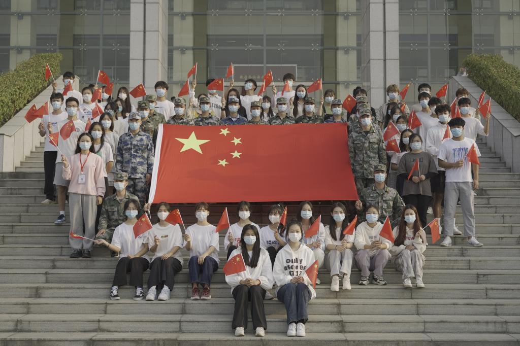 2022年10月1日,体育学院在西湖校区逸夫图书馆北广场组织观看“红旗飘,青春扬”我与祖国同呼吸升旗仪式,各班学生代表参加此次仪式。