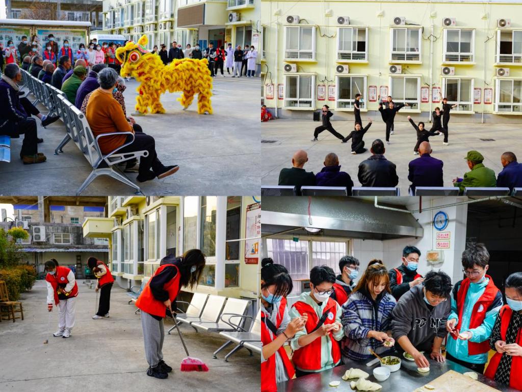 弘扬雷锋精神,关爱老人生活。 3月15日,阜阳师范大学青年志愿者协会、阜阳师范大学“八一”社、阜阳师范大学体育学院青年志愿者协会共同前往阜阳市颍州区光荣院开展志愿活动。志愿者们为老人献上精心准备的文艺表演,陪老人聊家常听他们讲述年轻时候的故事和现在的生活状况,为老人打扫庭院、包饺子。志愿者们的服务受到老年人的热情欢迎,让原本祥和的养老院也因此而更加欢快,充满活力。