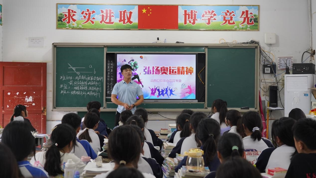 体育运动中有不少弘扬爱国、敬业、诚信、友善、团结精神的典故案例,支教团成员结合自身体育专业学习,利用夺冠视频、故事分享、知识竞答、体育游戏等形式,动静结合地带领大家感受体育运动的魅力,领悟运动健儿身上的拼搏精神。