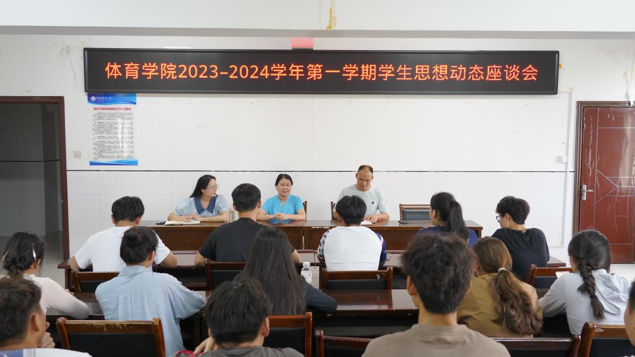 为及时全面了解学生的思想动态,做好学生工作,体育学院于9月18日在体育馆四楼会议室召开新学期学生思想动态调研座谈会,体育学院党委书记于少华、副院长杨中皖、分团委负责人张凯丽及各班级学生代表参加。
