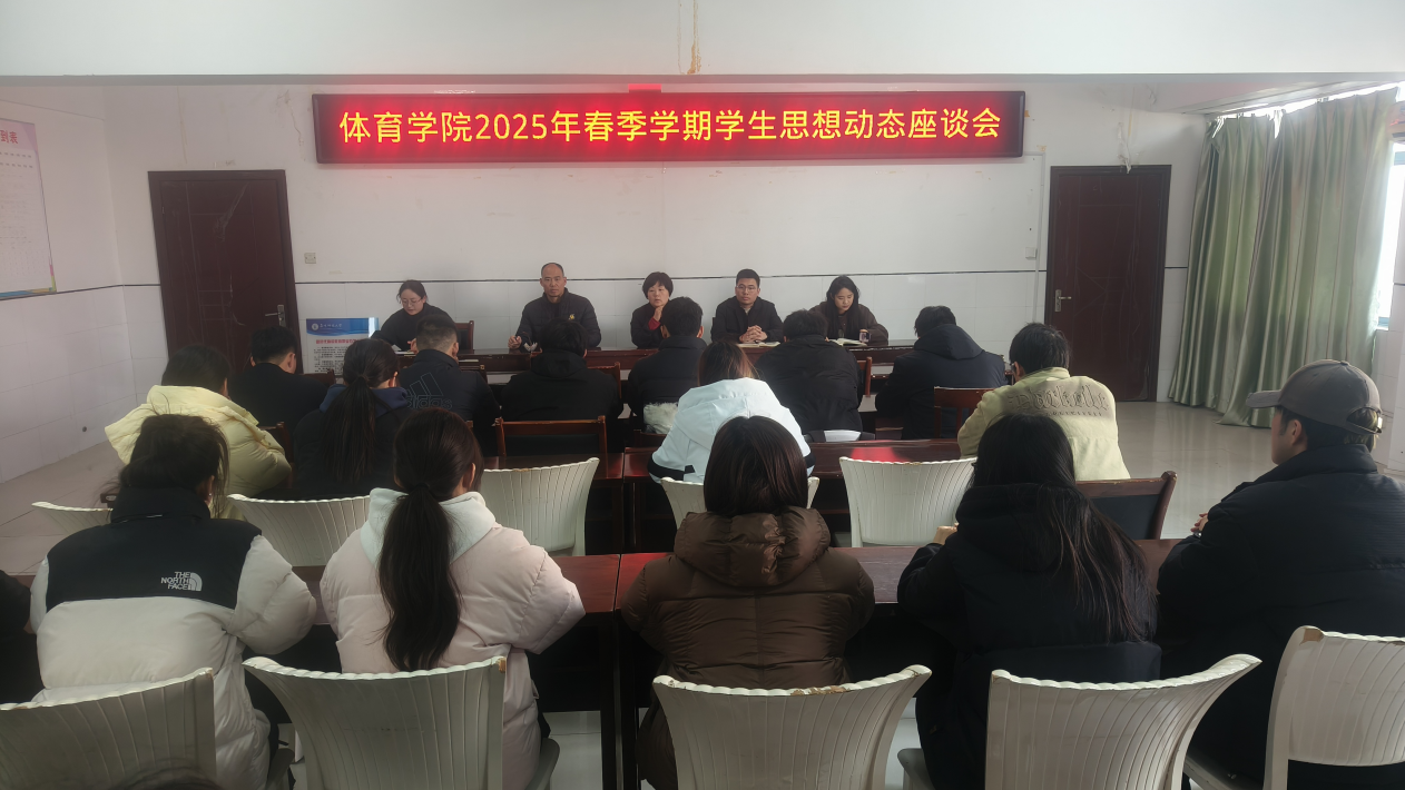 为全面了解新学期学生返校后的思想情况,增强学生教育管理工作的针对性、实效性,体育学院于2月19日在体育馆四楼会议室召开新学期学生思想动态座谈会,体育学院党委副书记徐春婷、副院长杨中皖、辅导员刘安国、童珊珊、张凯丽及学生代表参加。座谈会由张凯丽主持。