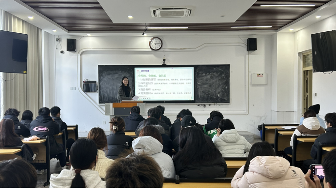 2022级表演3班汪雪婷带领大家学习习近平总书记给中国国际大学生创新大赛参赛学生代表重要回信精神,她结合回信中“青年是创新的重要生力军”的殷切嘱托,引导大家将个人成长融入创新创业浪潮。随后,2024级研究生李茜和2022级表演1班蒋牧夏分别向大家展示了团队的创新创业成果,复盘了团队参与创新创业竞赛的备赛历程,生动讲述了团队在协作中突破自我的故事,并向学弟学妹传授了赛事申报与团队协作的实用技巧。