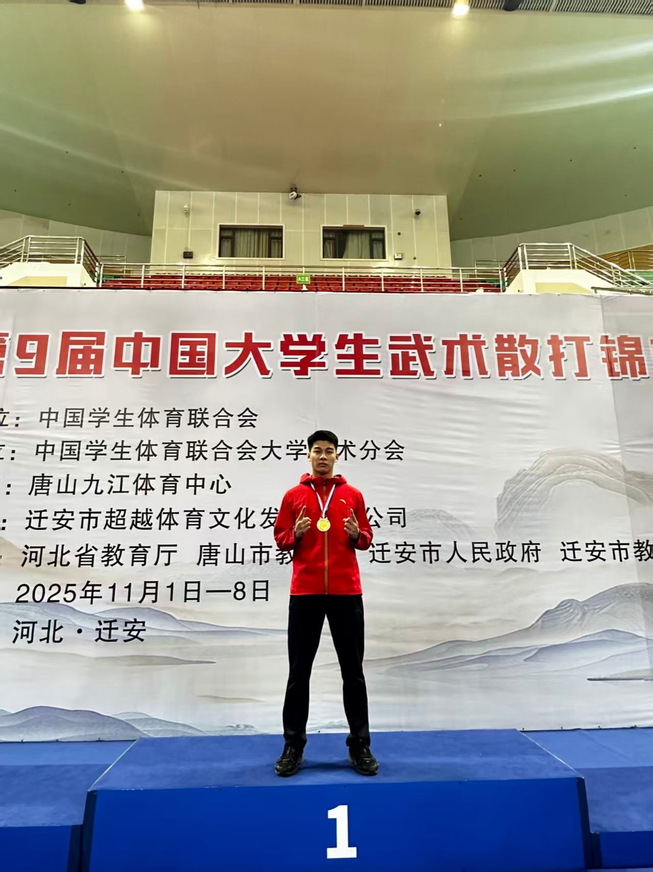 2025年11月3-7日,第9届中国大学生武术散打锦标赛在河北省迁安市九江体育中心燃情开赛并圆满落幕。本次赛事由中国学生体育联合会主办,有中国政法大学、湖南大学、成都体育学院等167所高校1195名大学生武术健儿汇聚于此同台竞赛,以武会友,用拳脚书写荣誉和传奇,全面展示当代大学生的散打专业技能和综合素养。体育学院积极组织学生备赛备训,最终由张庆珍老师带领4名同学参加此次盛会。