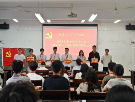 了加强对新党员的教育,激励广大党员坚定理想信念,献身党的事业,更好的发挥党员的模范带头作用,7月4日下午,物理与电子工程学院党委在躬行C楼505教室隆重举行了新党员宣誓暨党员授牌仪式。2024年6月发展的34名新党员参加了仪式,仪式由自动化系学生党支部书记李聪主持。
