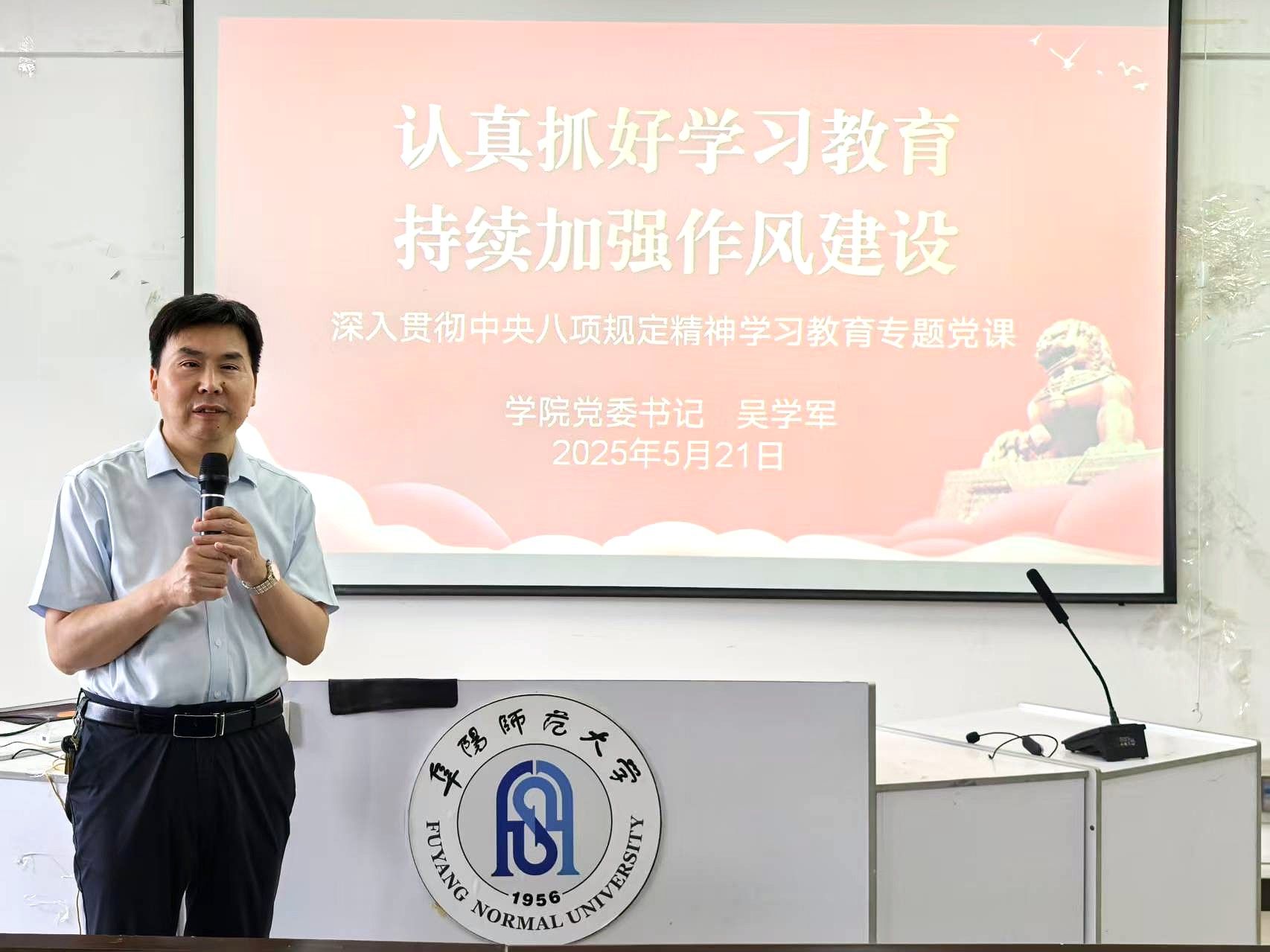 为扎实推进深入贯彻中央八项规定精神学习教育,5月21日下午,物理与电子工程学院党委书记吴学军以《认真抓好学习教育,持续加强作风建设》为题,为全院教职工党员讲授深入贯彻中央八项规定精神学习教育专题党课。