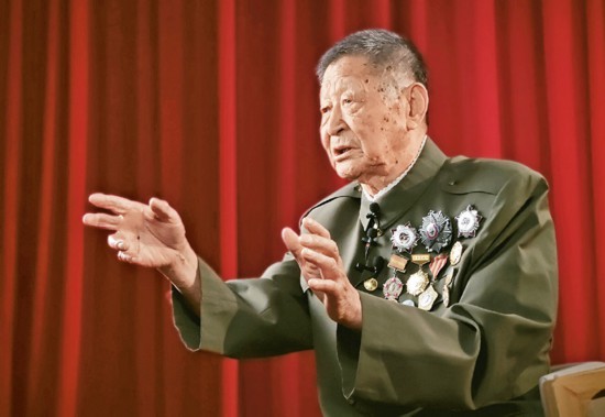 图为2024年9月10日,黄宗德在接受采访时讲述自己的战斗经历。 新华社发 靳宪彬/摄