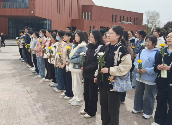 上午八时三十分,参加活动的师生在学院楼下整齐列队、整装待发。在老师的带领下,同学们整齐有序地沿着既定路线踏上前往和平公园的征程。春寒料峭中,历时两小时的徒步行程既是对革命先辈艰苦奋斗精神的致敬,也是对青年学子意志品质的锤炼。抵达松柏环绕的和平公园后,全体人员在烈士纪念碑前肃立,师生代表缓步上前敬献鲜花,全体人员鞠躬致敬。朵朵白菊承载着对英烈的深切缅怀,被轻轻摆放在岩石基座四周。