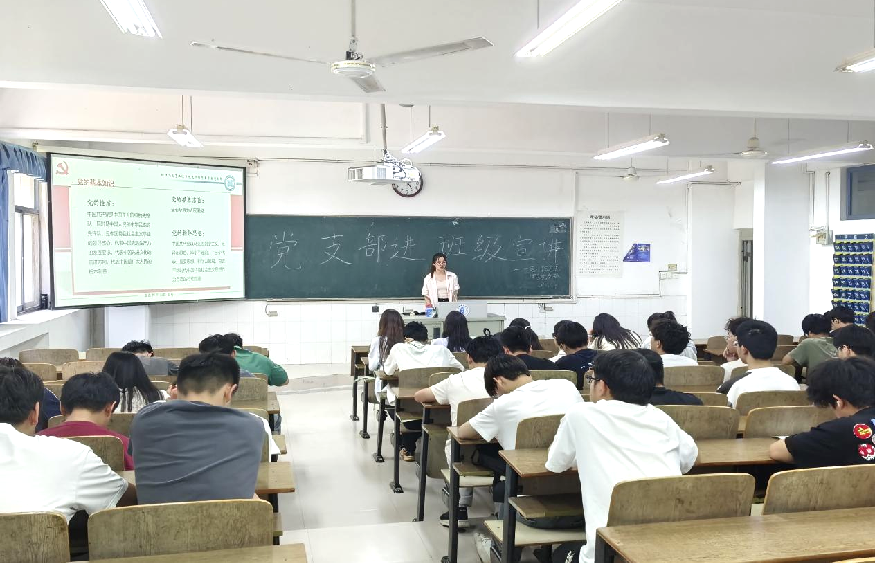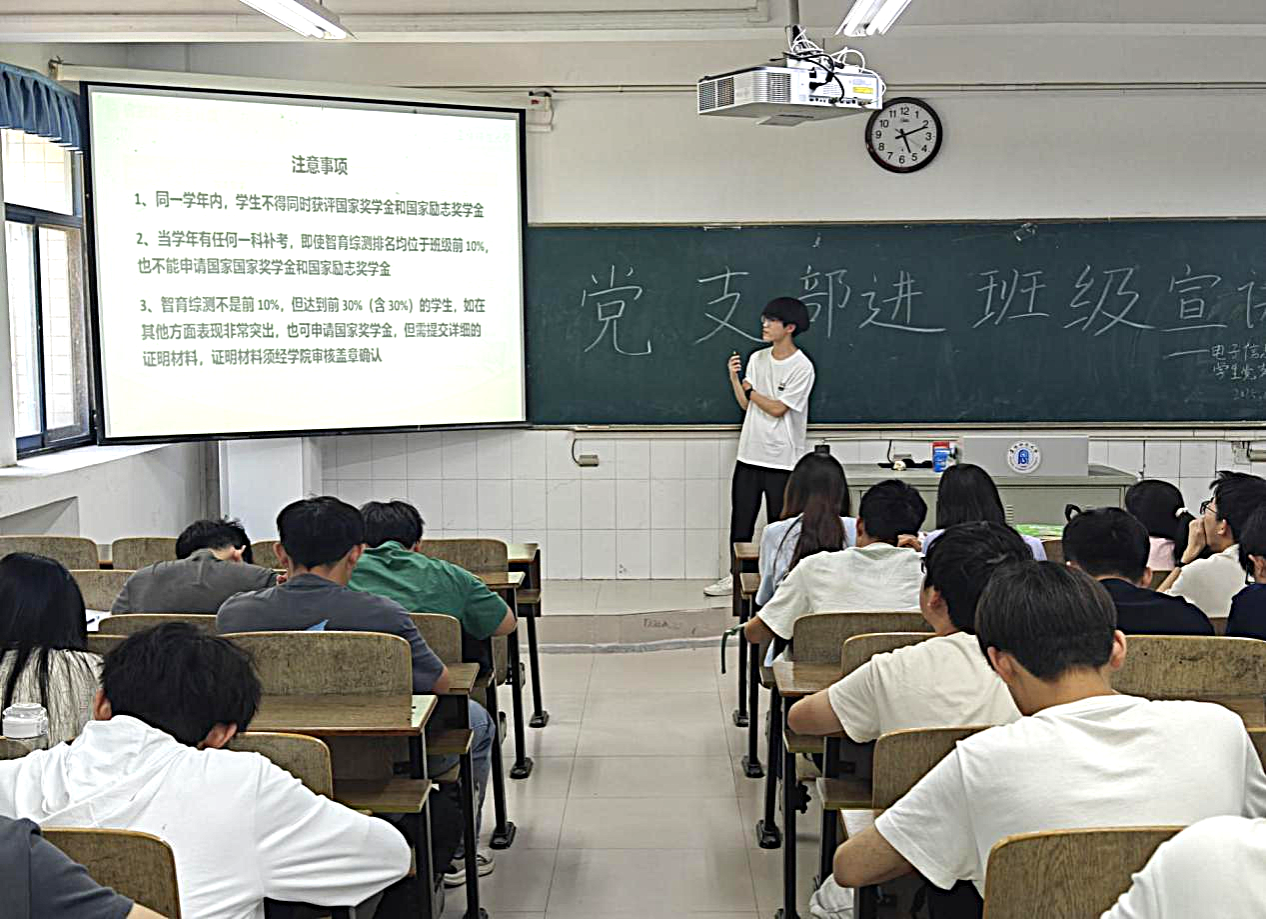 为充分发挥基层党组织战斗堡垒作用,强化党建引领育人实效,6月4日下午,电子信息系学生党支部在躬行A楼103教室开展“党支部进班级”主题活动,活动面向2024级电子信息系在校学生。