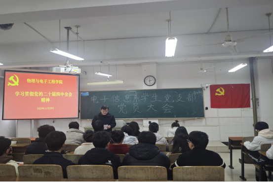 为深入学习领会、全面准确把握党的二十届四中全会精神,进一步加强党员的理论武装与思想建设,2025年11月22日下午,电子信息系学生党支部于躬行A楼307开展学习党的二十届四中全会精神专题党课,此次党课由支部书记陶清主讲。