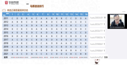 系列直播课中,华图教育考研辅导专家结合经典题型析考情、串考点、讲方法、点思路,引导同学们制定有针对性的冲刺复习计划,并对2022年考研政治、英语进行了命题预测。考研政治冲刺直播课紧扣最新政治考试大纲,详解历年真题、梳理知识难点、解析时政热点、分享复习策略、讲授答题技巧。考研英语冲刺直播课从“阅读理解答题技巧、作文万能句型和常见亮点词汇”等方面,讲解“英语二”常见题型的答题思路与模板分析。