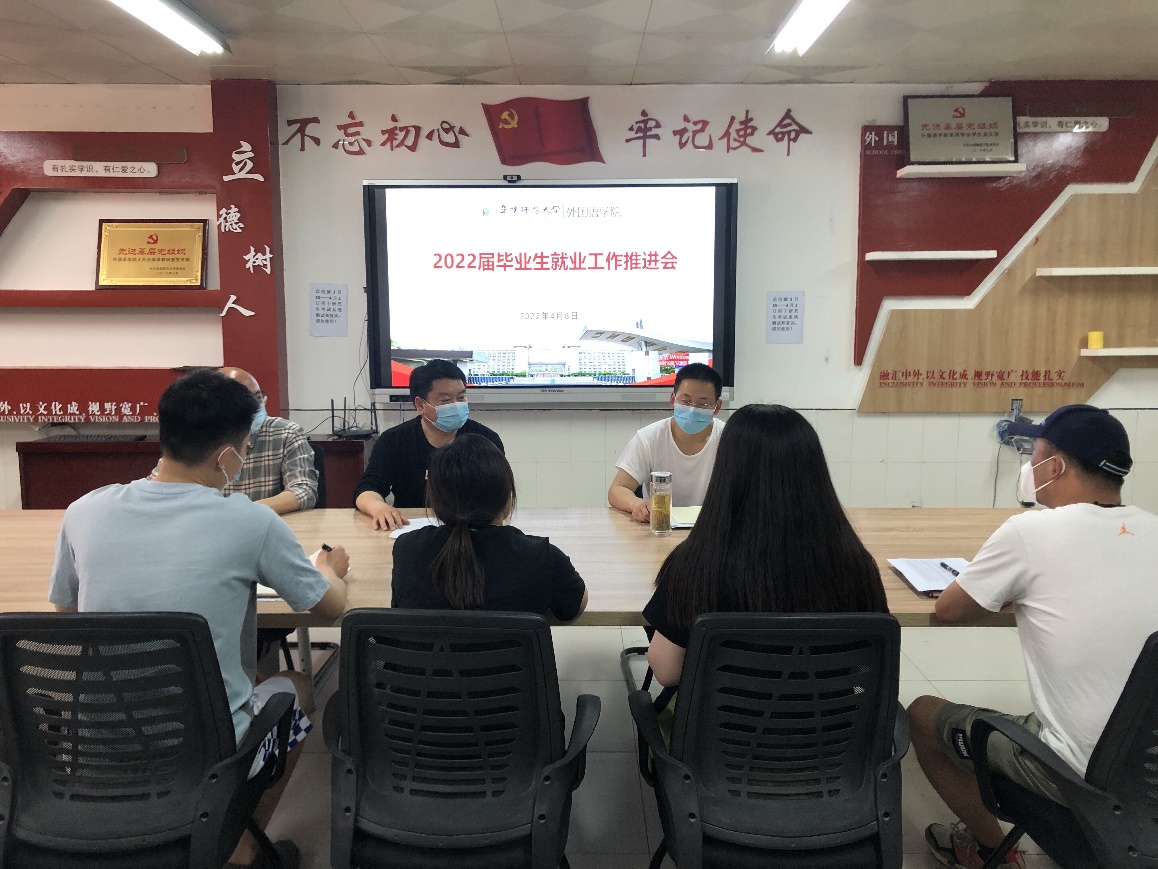 为统筹推进疫情防控期间毕业生就业工作,4月9日,外国语学院举行专题会议,部署推进疫情期间2022届毕业生就业工作。学院党政班子成员及毕业班辅导员参加会议。会议由学院党委书记刘张飞主持。