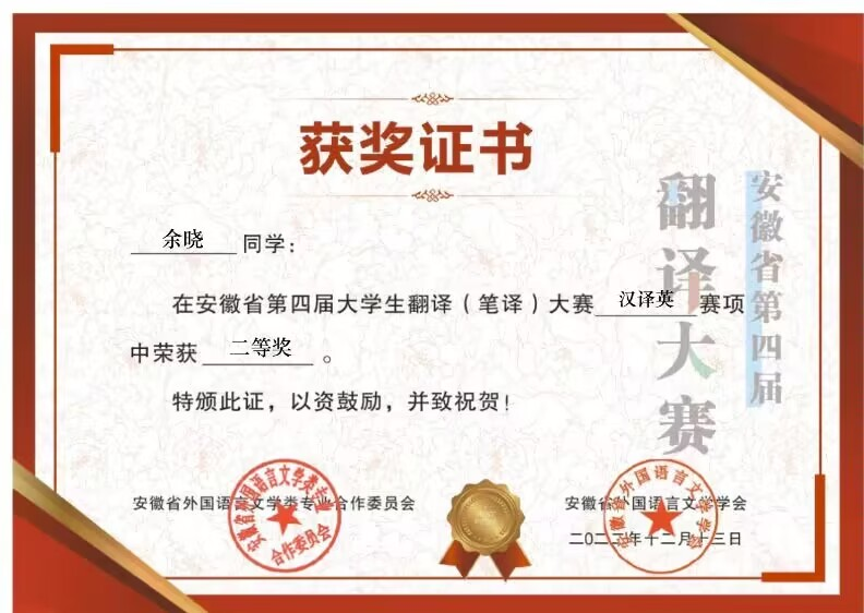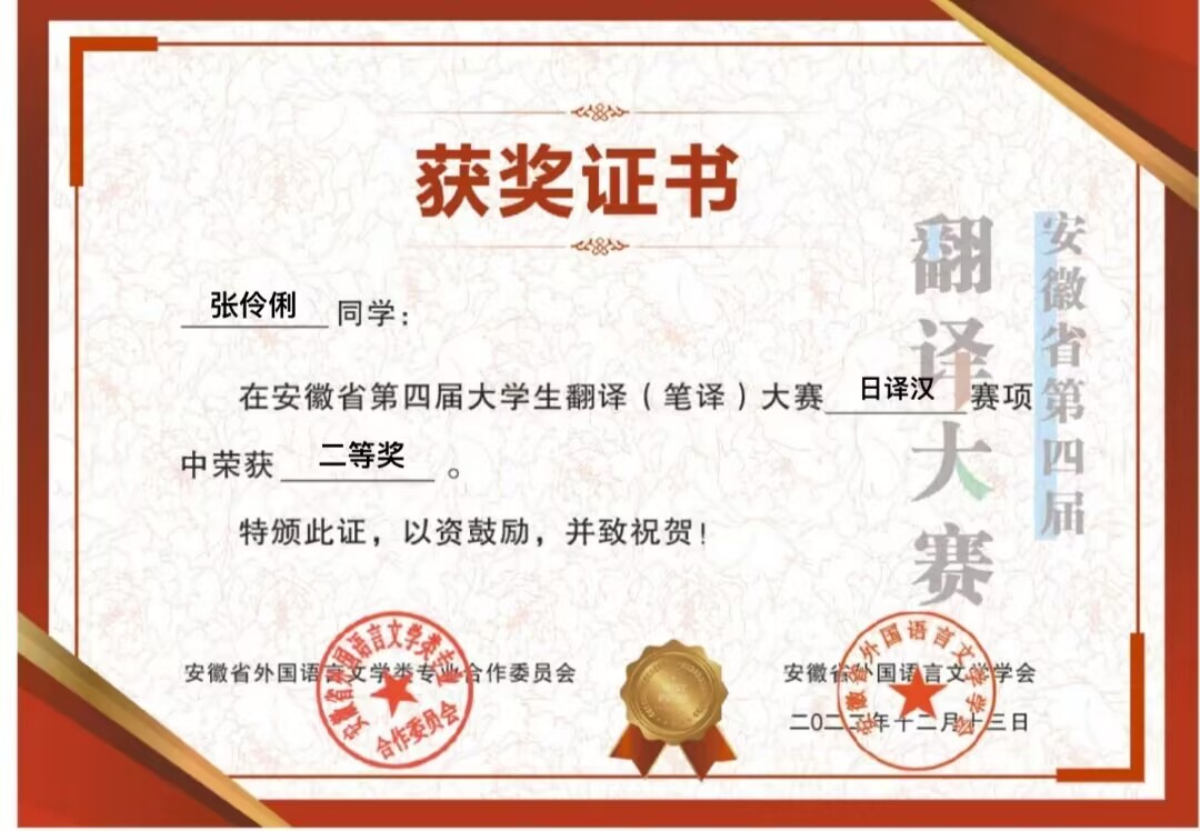 近日,安徽省第四届大学生翻译(笔译)大赛获奖名单正式公布。外国语学院喜获省级二等奖2项(日译汉、汉译英),省级三等奖4项,优秀指导老师奖6项。比赛成绩充分展示了外国语学院学生扎实的语言功底、过硬的翻译技能及优秀的综合素质。
