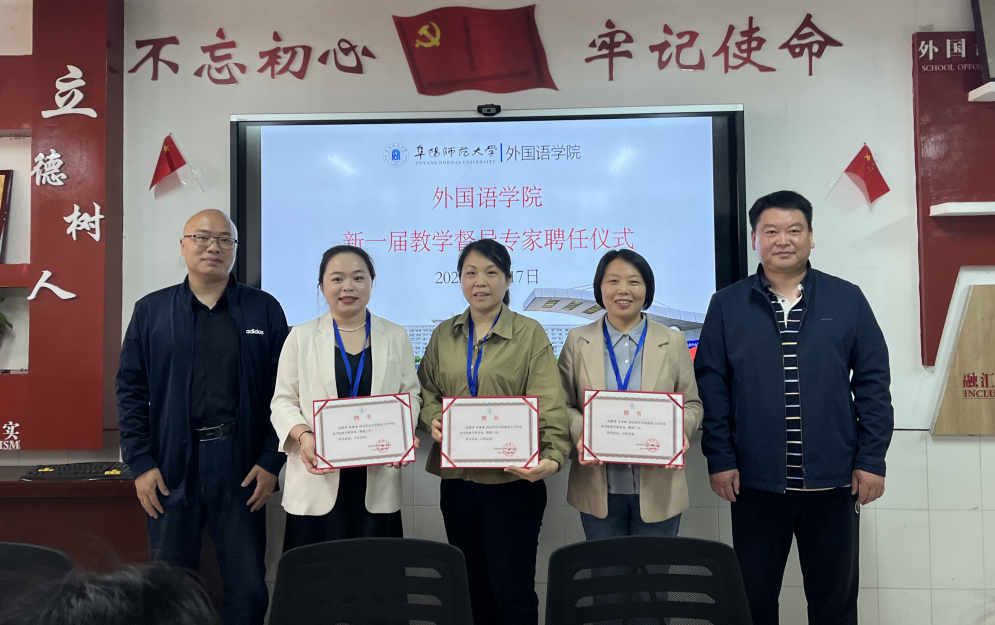 4月17日上午,外国语学院举行了新一届教学督导专家聘任仪式,院长赵从义出席聘任仪式并讲话,副院长高福猛、新一届教学督导组全体成员、外国语学院各系部主任参加了聘任仪式。仪式由高福猛主持。