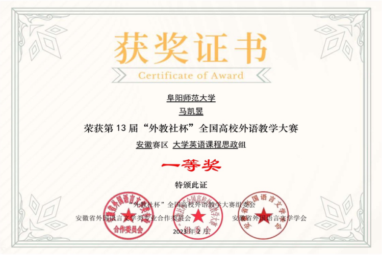 第十三届“外教社杯”全国高校外语教学大赛安徽赛区比赛结果于近日公布。外国语学院马凯昱教师团队(马凯昱、候雨辰、张宇、凡婧,指导教师杨波)凭借扎实的教学基本功和极强的课堂把控能力,在全省76组参赛团队中脱颖而出,荣获安徽赛区大学英语课程思政组一等奖。