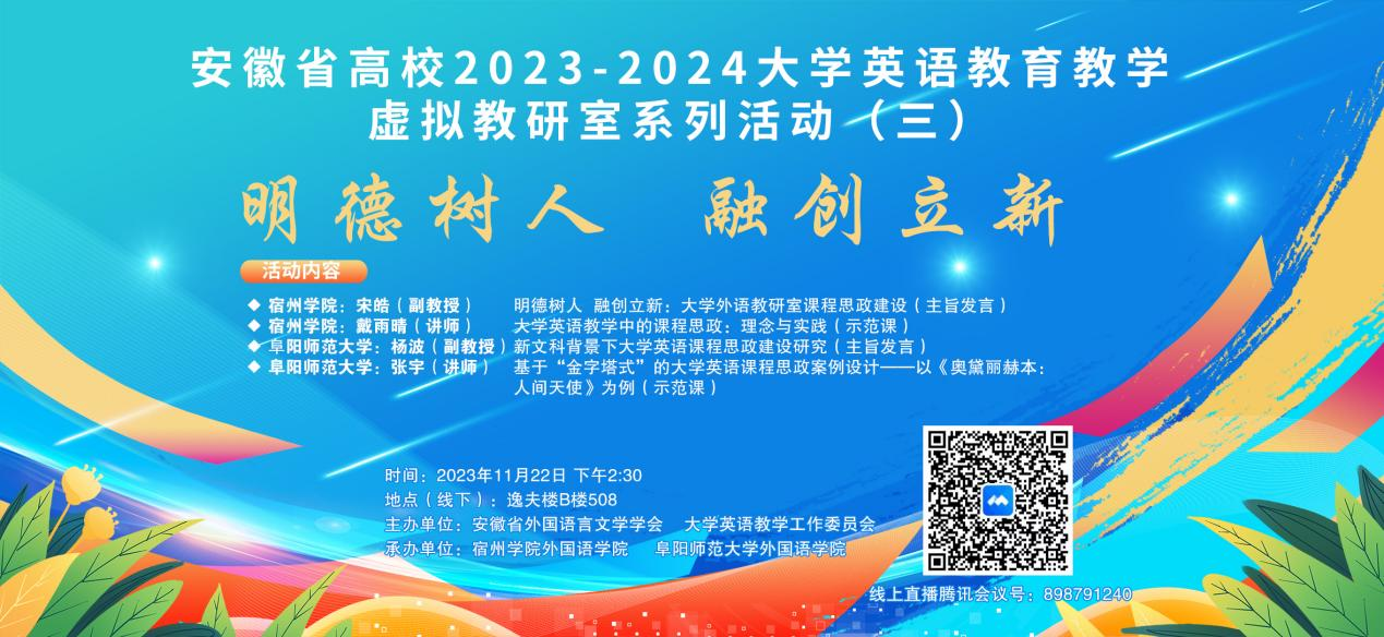 11月22日,由安徽省外文学会和大学英语教学工作指导委员会主办、阜阳师范大学外国语学院和宿州学院外国语学院联合承办的安徽省高校大学英语虚拟教研室教学研讨活动在线上顺利举行。外国语学院大学英语教学部主任杨波副教授、教学部教师张宇分别作主旨报告,教学部全体教师参会,省内各院校200余名领导和老师在云端同步参与研讨活动。