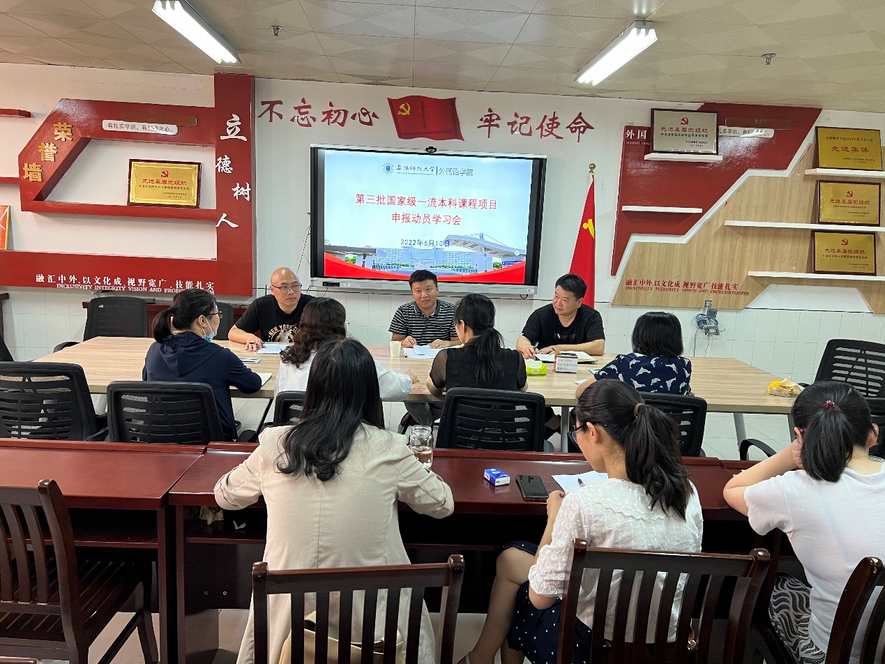 6月10日上午,外国语学院在景行楼816召开第三批国家级一流本科课程项目申报动员会。教务处教师教学发展中心主任郑继兵到会指导。学院院长赵从义、副院长高福猛、省级一流课程负责人及部分团队成员参加会议。会议由赵从义主持。