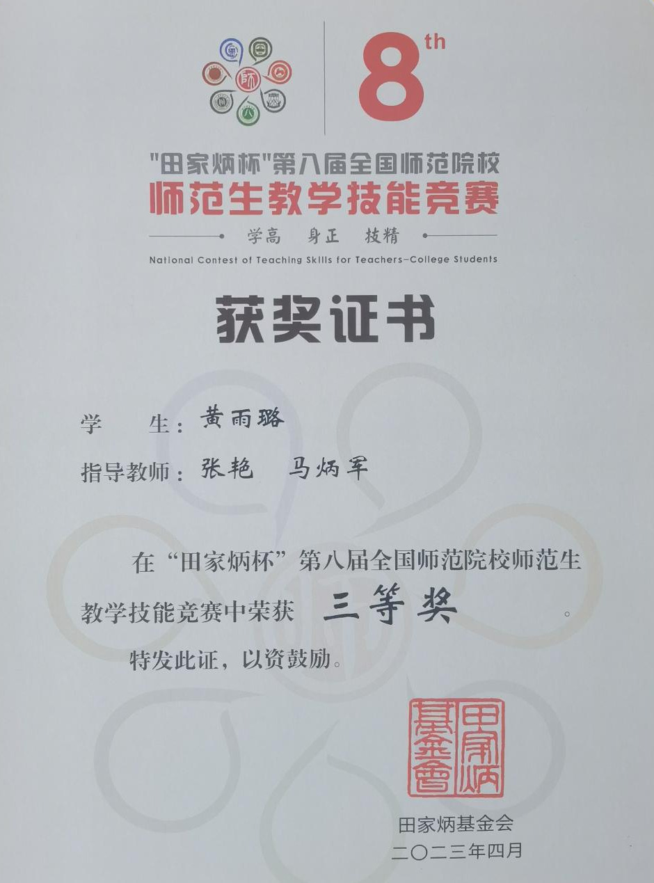 近日,“田家炳杯”第八届全国师范院校师范生教学技能竞赛决赛在浙江师范大学举行,外国语学院英语专业黄雨璐同学荣获高中英语组三等奖。