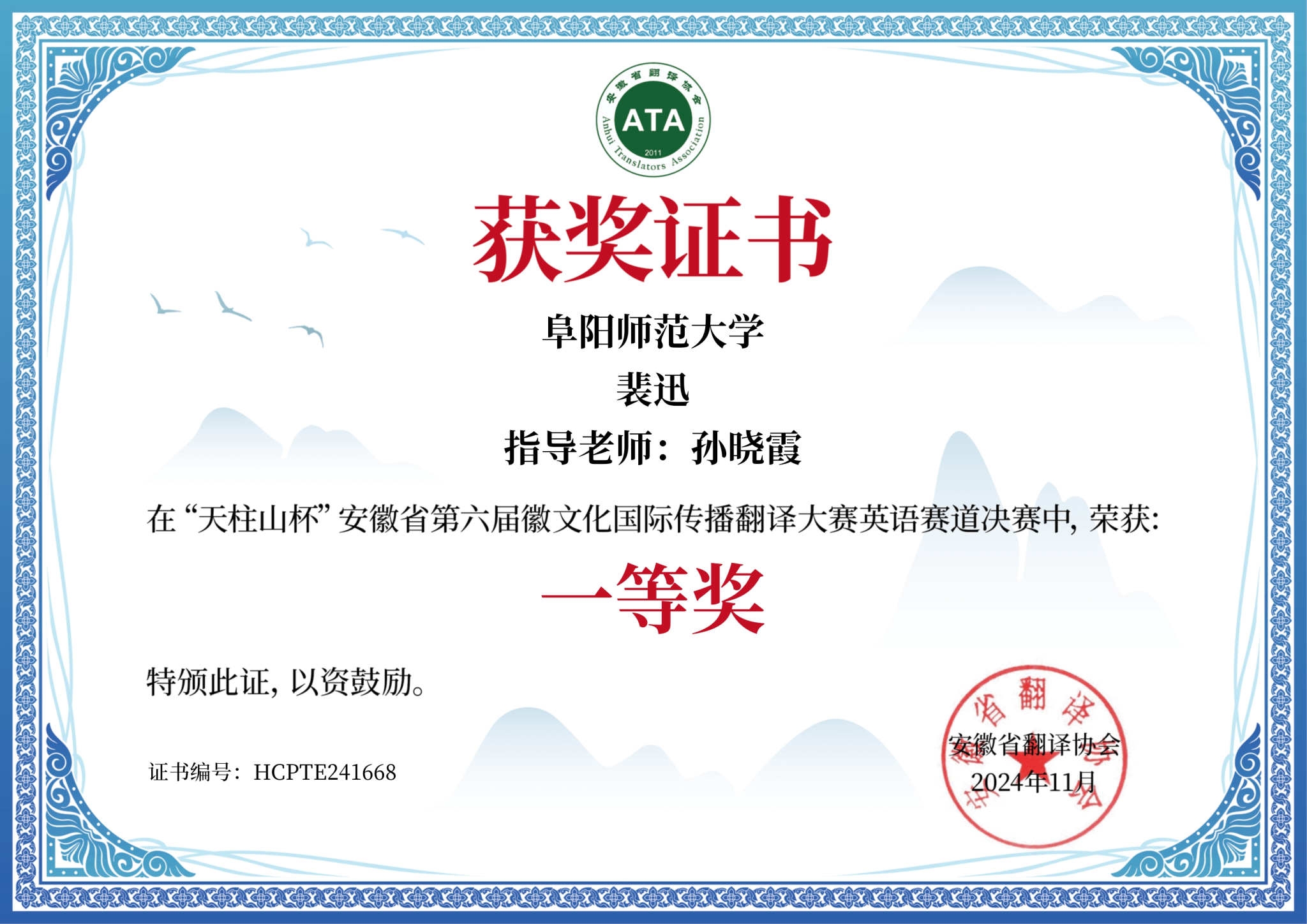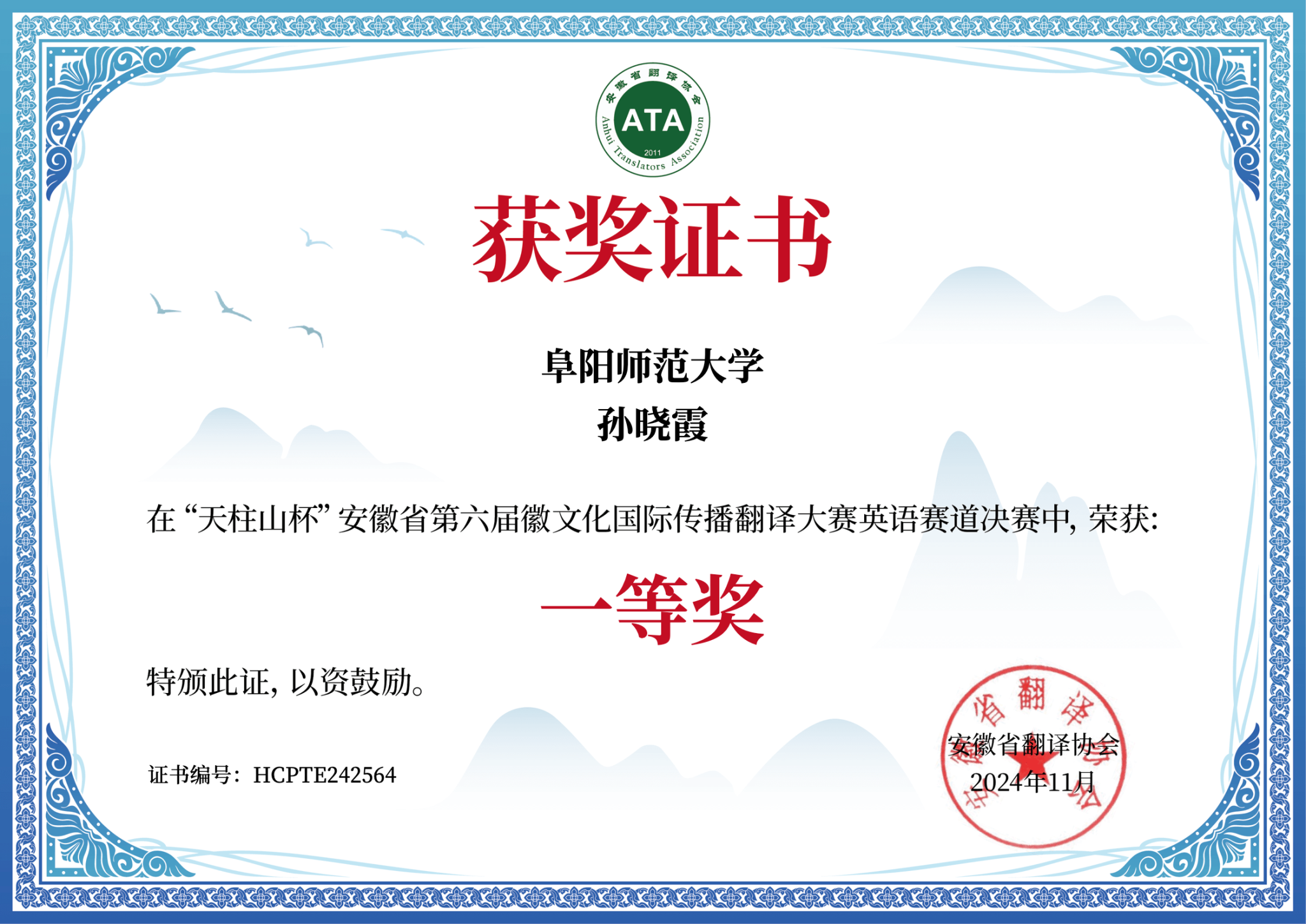 据悉本届大赛由安徽省翻译协会和安庆市人民政府外事侨务办公室联合主办,以“山水诗画 大美宜城”为主题,旨在通过英语翻译比赛,向全球传播安徽省自然风光和文化底蕴,促进徽文化国际传播。比赛于2024年11月举行,吸引了中国科学技术大学、安徽大学、安徽师范大学、西安外国语大学、天津外国语大学等省内外共计1700余名英语翻译爱好者参加。