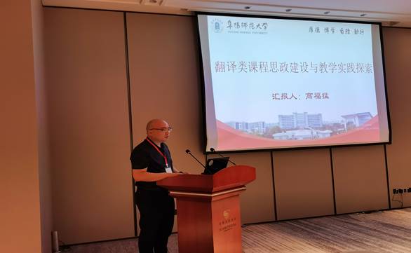 高福猛应邀参加分论坛,并作题为“翻译类课程思政建设与教学实践探索”的交流报告。报告以教育部发布的《高等学校课程思政建设指导纲要》为主线,通过大量教学实例,详细分析了翻译类课程思政建设的主要内容,指出专业主干课程须要拓展广度、深度和温度,增加知识性、人文性,提升引领性、时代性和开放性;实践类课程要做到学思结合、知行统一,培养创新精神和实践能力。高福猛还结合近期修订的2021版人才培养方案,分享了阜阳师范大学外国语学院翻译专业学生提升实践能力和创新创业的经验和做法。
