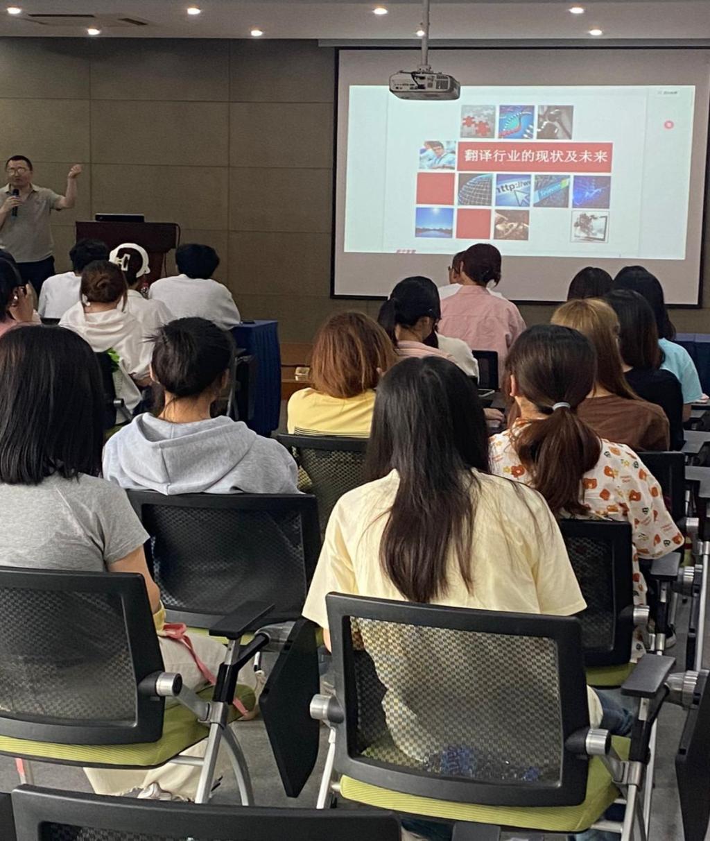 6日上午,师生抵达合肥立创信息系统有限公司,公司工作人员陪同翻译系师生来到合肥创新创业园,参观了立创信息系统有限公司专职译员工作场所。立创公司总经理武博给同学们作了一场主题为“翻译行业的现状及未来”的讲座。讲座中,武博从行业形势、专业方向、发展定位等角度,为同学们提供了翻译行业前沿信息,剖析了当前行业发展前景,帮助同学们规划未来职业发展,并鼓励同学们把握学习机会,持续提高语言能力,积累翻译实践经验。