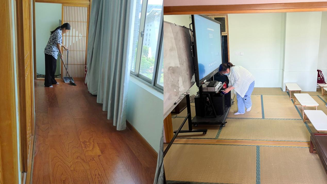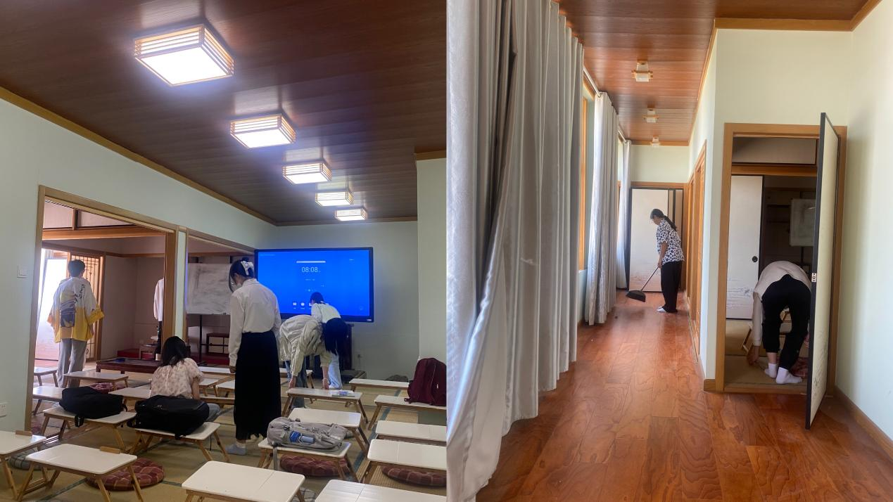学生们手持扫帚、抹布等工具,认真细致地打扫着每一个角落,将折叠桌、坐垫摆放整齐,用实际行动为教室环境的整洁贡献自己的力量。