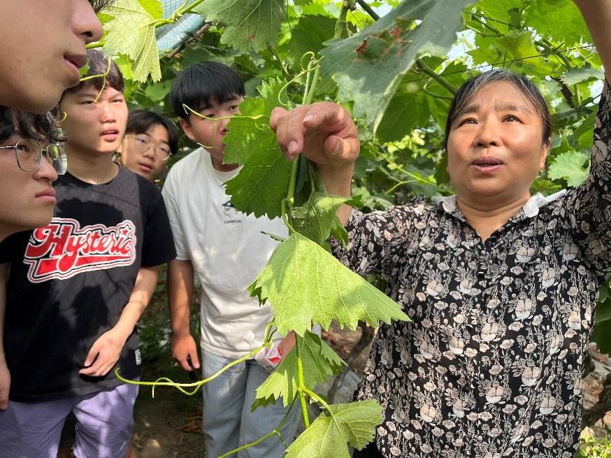在劳动实践环节,总经理蒋祥红详细地向师生讲解了葡萄种植和管护知识,指出当前正是葡萄结果的关键时期,为了保证果树的养分集中供应,需要适时修剪掉多余的枝条。