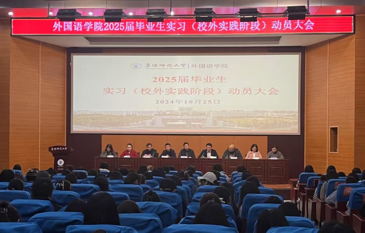 为扎实推进2025届毕业生校外实习实践顺利开展,细致做好实习就业指导服务工作,10月25日,外国语学院在西湖校区躬行F楼报告厅召开2025届毕业生实习(校外实践阶段)动员大会。外国语学院党政班子、各专业负责人、实习指导教师、毕业班辅导员以及2025届本科毕业生参加大会。大会由副院长高福猛主持。