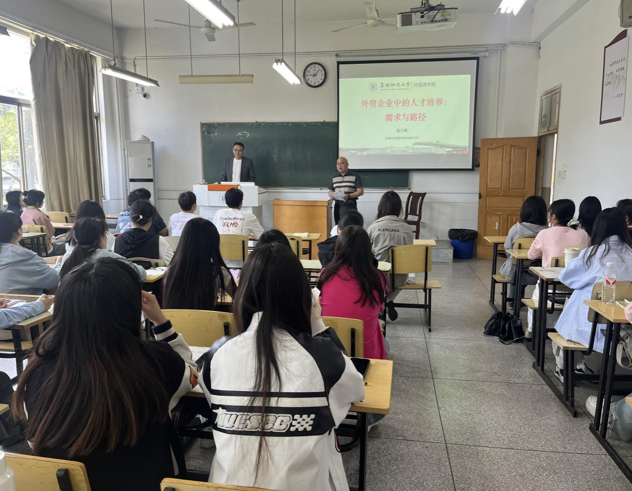 4月25日上午,外国语学院邀请阜阳市颍东区政协常委、安徽西农国际贸易有限公司董事长潘兴顺在景行楼102为翻译专业2023级同学做题为“外贸企业中的人才培养:需求与路径”专题讲座。讲座由外国语学院副院长高福猛主持。
