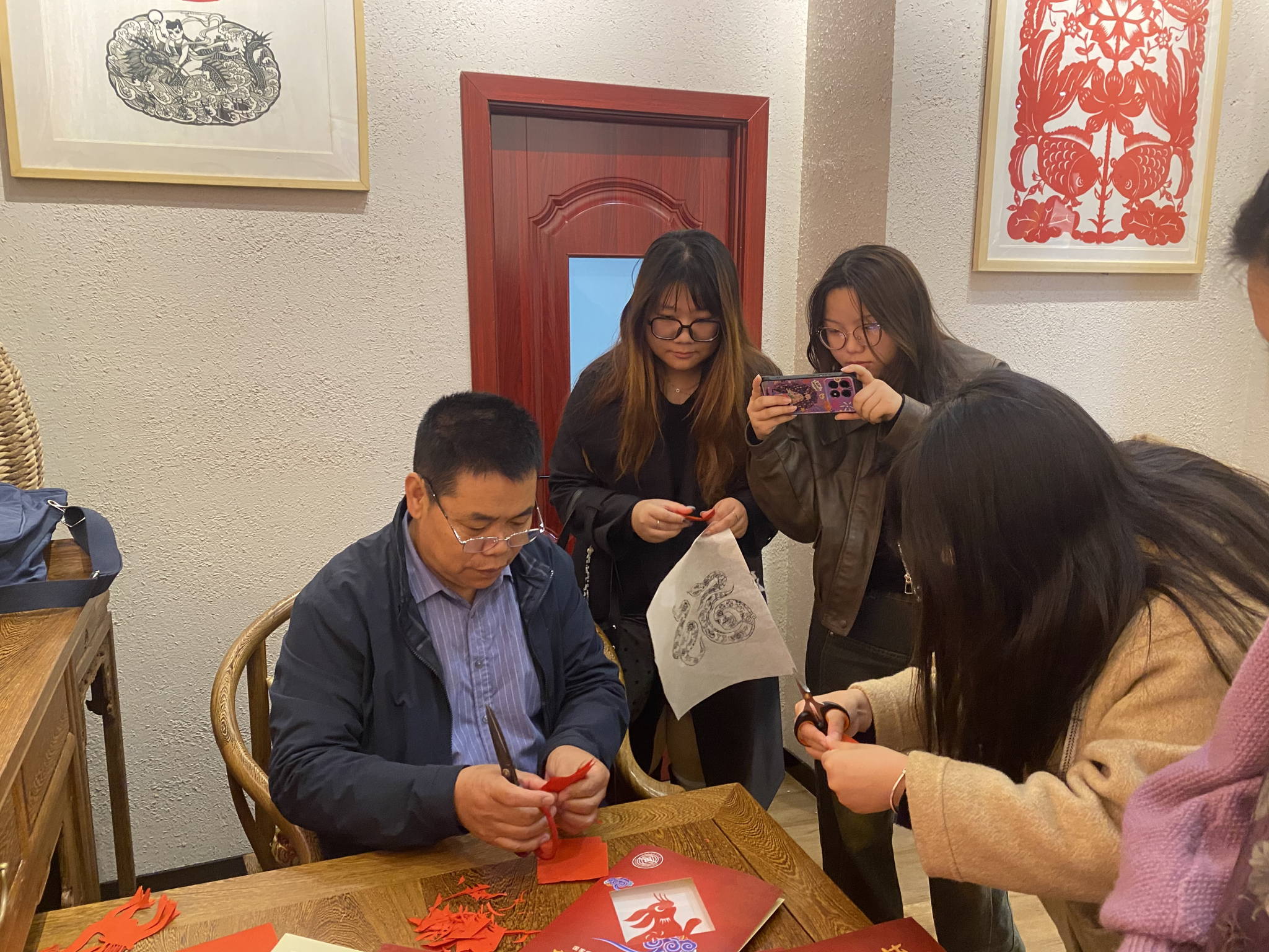 同学们在讲解员的带领下,参观了非遗保护中心,对阜阳的非物质文化遗产有了初步的了解。随后他们在阜阳剪纸国家级传承人程兴红、临泉面塑传承人陈庆云的亲手指导下,体验了阜阳剪纸、临泉面塑、木版年画等传统技艺,对精湛的技艺赞不绝口,获益匪浅。最后,在见习老师们的指导下,进行推介阜阳非遗的翻译实践活动。