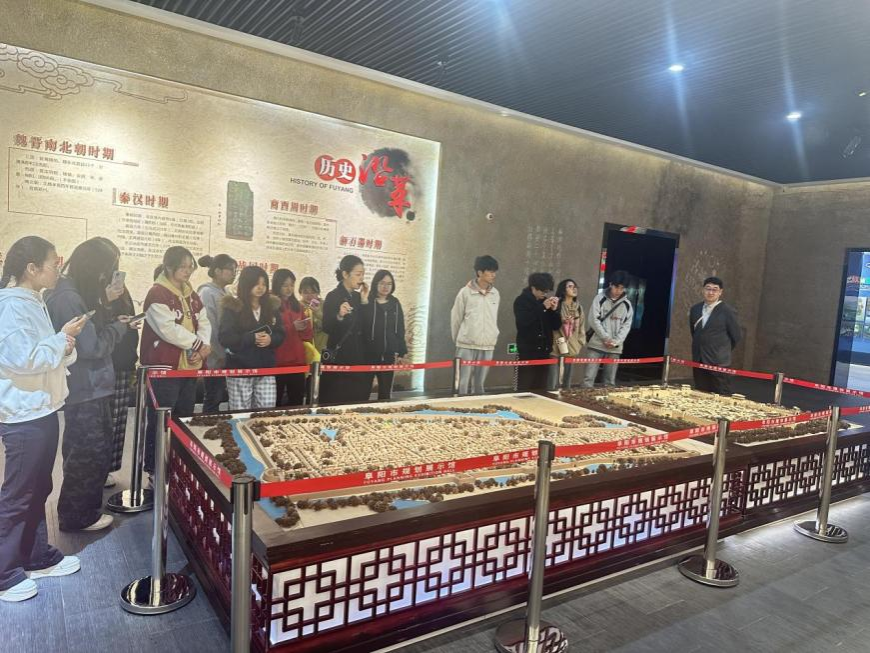 同学们首先参观了展示馆内的历史沿革展区。在阜阳历史沙盘模型前,大家通过逼真的模型和墙上的文字介绍,详细了解了阜阳从新石器时期、商周时期,到秦汉、魏晋南北朝等不同历史阶段的城市发展脉络,感受这座城市深厚的历史底蕴。