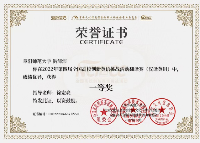 近日,2022年第四届全国高校创新英语翻译赛圆满结束。我院2022级学科教学(英语)研究生洪沛沛与来自上海外国语大学、南开大学和北京外国语大学等众多高校万余名选手同台竞技,喜获汉译英组一等奖和英译汉组三等奖。