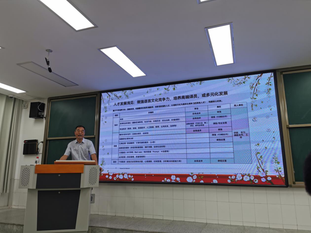 8月28日上午,外国语学院邀请第四届全国翻译硕士专业学位教育指导委员会副主任委员、广东外语外贸大学教授、博士生导师赵军峰,作了题为“从‘基石’到‘顶石’:翻译人才培养的理念与原则”的专题讲座。讲座由外国语学院院长赵从义主持,学院党政班子及全体教师到会聆听。