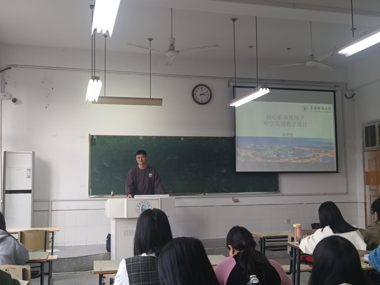 11月1日,研究生导师高理想在景行楼104教室做了题为“核心素养视域下中学英语教学设计”的讲座。首先,他介绍了英语学科教学目标“从双基到三维目标再到现在的核心素养”的发展变化;其次,他对教学计划的设计原则和具体内容进行了详细介绍,包括如何分析背景信息、如何以学生为中心设计教学目标、如何选择合适的教具等内容;最后,高老师向学生展示了优秀的教案范例和优秀板书设计,让学生更加直观地了解如何写出优秀的教学案例。