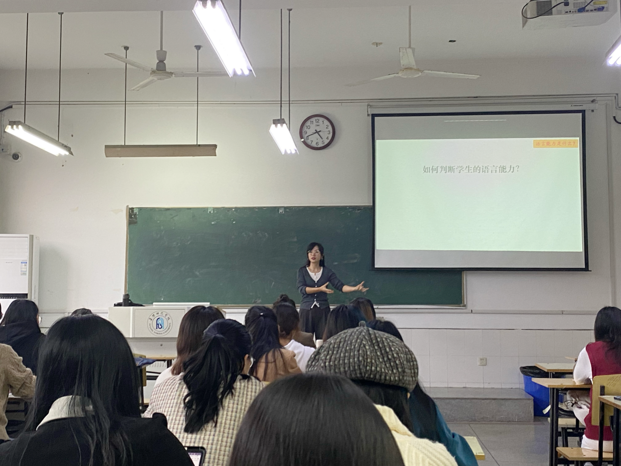10月28日,研究生导师亓迪在景行楼104教室做了题为“课标中的语言能力和能力指标”的讲座。她指出,评判学生的语言能力是英语教学中非常重要的一环,并介绍了我国的评价标准(主要依据2022年版义务教育课程标准)、CEFR(欧洲共同语言参考框架)和WIDA(美国本土的测试体系),带着学生详细学习相关等级要求,通过与学生一起讨论的方式让学生能够发现不同评价标准的侧重点,并使他们对语言能力的评价标准有了新的理解。